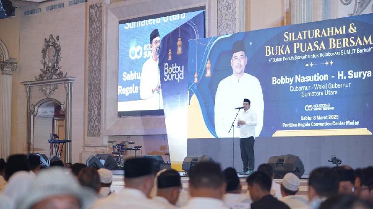 Metro24Jam.id – Medan. Gubernur Sumatera Utara (Sumut) Bobby Nasution menghadiri acara Silaturahmi dan Buka Puasa Bersama yang digelar Tim Pemenangan Bobby-Surya di Regale Convention Center Jalan Adam Malik Medan, Sabtu (8/3/2025).