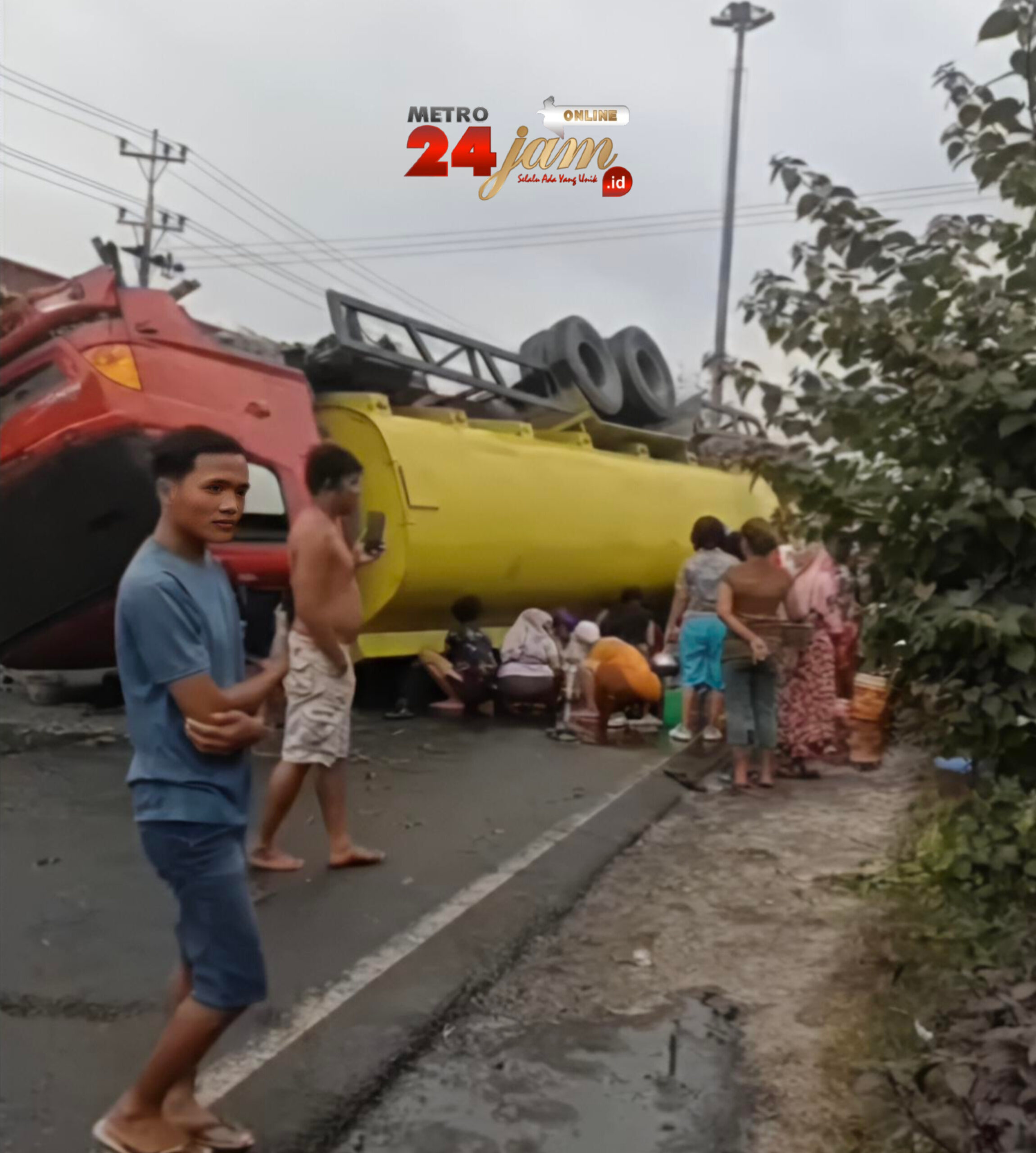 “Kemungkinan sopirnya mengantuk, bang. Karena tiba-tiba aja truk oleng dan langsung menabrak median jalan. Truk terguling dan minyak di dalam tangki berluberan ke jalan-jalan,” ungkap saksi mata. (hidayat ahmad)